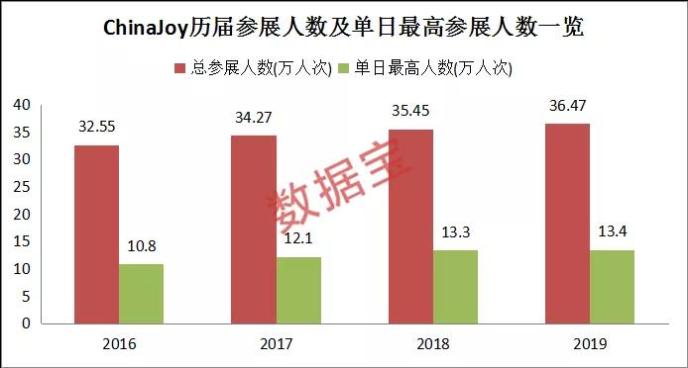 過去5年,ChinaJoy參展人數逐年上升,2019年達到36.47萬人,單日參展人數創歷史新高。