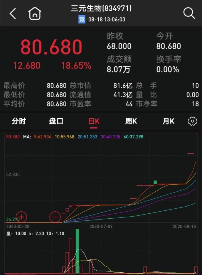 更為純粹的赤蘚糖醇概念股來自新三板的三元生物。公司主要從事赤蘚糖醇及其復配產品的生產、銷售,上半年實現營業收入3.52億元,實現凈利潤1.1億元,同比分別增長82.14%和74.65%。公司股價表現更是驚人,從年初的15元到8月18日已經上漲到80.68元,漲幅超過4倍。