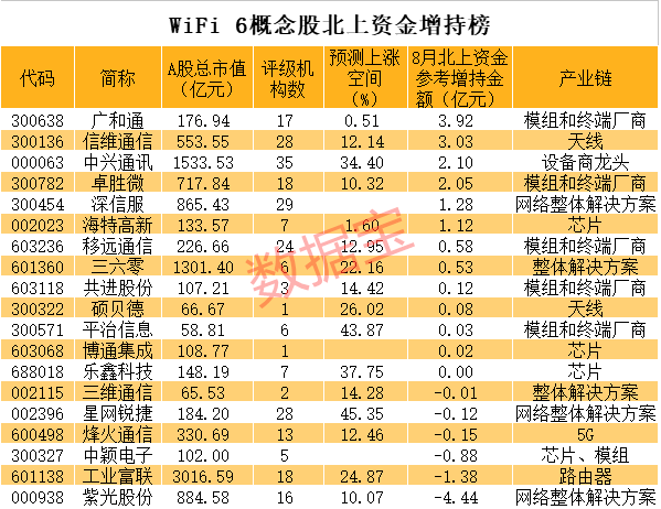 證券時報·數(shù)據(jù)寶不完全統(tǒng)計顯示,A股上市公司中WiFi 6相關(guān)概念股有33家以上,A股市值合計超1.1萬億,3股市值超千億,分別是工業(yè)富聯(lián)、中興通訊、三六零。工業(yè)富聯(lián)與產(chǎn)業(yè)鏈相關(guān)產(chǎn)品有路由器,中興通訊是設(shè)備商龍頭,三六零屬于整體解決方案商。芯片相關(guān)公司包括樂鑫科技、博通集成、海特高新等,模組和終端廠商有卓勝微、移遠通信、共進股份等。