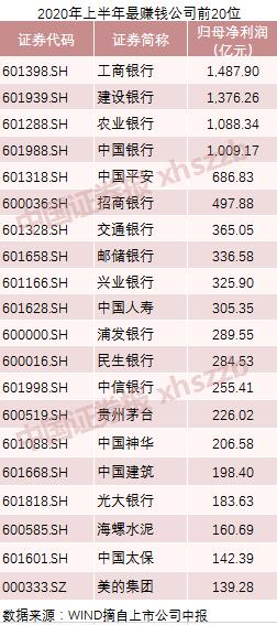 在2020年上半年最賺錢的20家公司里,上市銀行占據了其中的12家,且排名靠前。