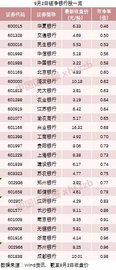 截至9月2日收盤,36家A股上市銀行仍然大面積“破凈”。只有平安銀行(行情000001,診股)、寧波銀行(行情002142,診股)、招商銀行(行情600036,診股)、常熟銀行(行情601128,診股)等10家銀行市凈率(PB)在1倍之上,其他銀行均處于“破凈”狀態。華夏銀行(行情600015,診股)PB長期低于0.5倍。