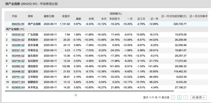 Wind數據顯示,雞產業指數上周(9月7日-9月11日)累計下跌9.33%,本月累計下跌12.12%,年初至今跌逾10%。
