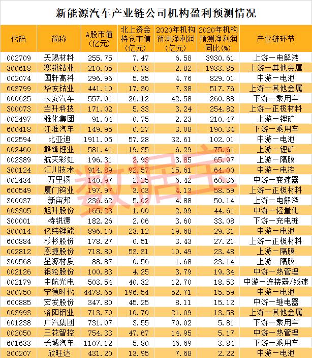 寧德時代、上汽集團(行情600104,診股)、比亞迪、長城汽車A股市值均超千億,其中比亞迪、長城汽車年內漲幅均已翻倍,分別達到121.26%、112.59%,與去年底相比,寧德時代、比亞迪市值增長均在千億元以上。新能源汽車產業鏈中,奧特佳(行情002239,診股)、天賜材料(行情002709,診股)、易事特(行情300376,診股)今年以來漲幅也已翻倍。不少產業鏈公司是北上資金重倉對象,據統計,北上資金超10億元持倉的有15家,包括寧德時代、匯川技術(行情300124,診股)、上汽集團、比亞迪、恩捷股份等,寧德時代獲北上資金持倉超190億元居首。