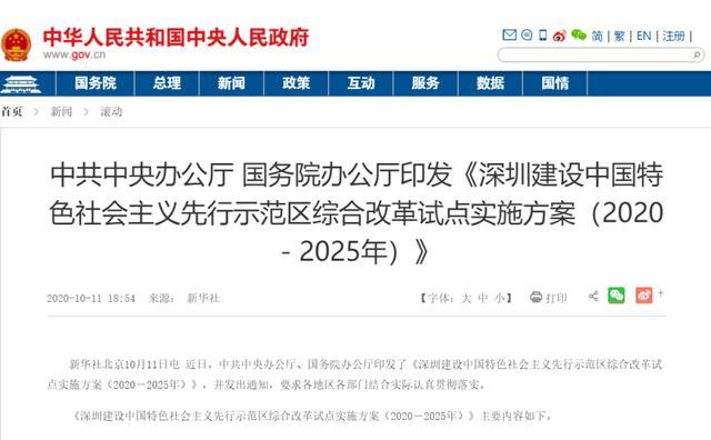 10月11日,中共中央辦公廳、國務院辦公廳印發了《深圳建設中國特色社會主義先行示范區綜合改革試點實施方案(2020-2025年)》,以設立經濟特區40周年為契機,在中央改革頂層設計和戰略部署下,支持深圳實施綜合授權改革試點,是新時代推動深圳改革開放再出發的又一重大舉措,是建設中國特色社會主義先行示范區的關鍵一招,也是創新改革方式方法的全新探索。