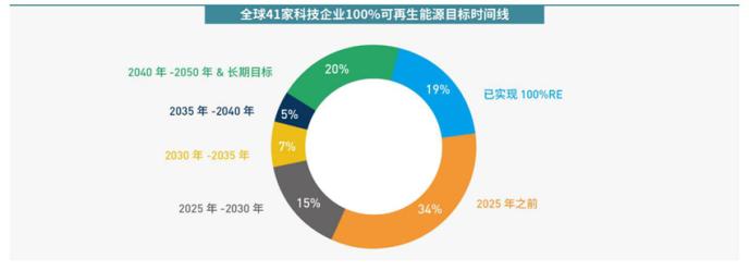 在過去的十年里,Google、APPle、Facebook等多家國際企業成為100%可再生能源變革的引領者。報告梳理了全球41家已率先設立長期100%可再生能源目標的科技企業,其中約20%已經實現了100%可再生能源目標,另外的約50%企業將實現100%可再生能源目標設置在2030年前,44%企業在2019年達到了60%或以上的可再生能源利用。