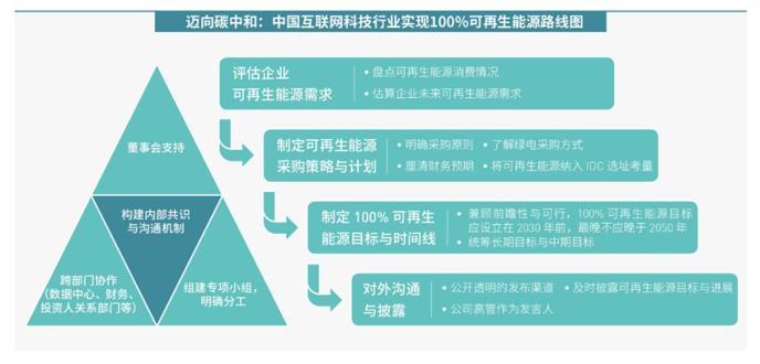 2021年1月12日,國際環保組織綠色和平發布《邁向碳中和:中國互聯網科技行業實現100%可再生能源路線圖》研究報告,提出中國互聯網科技企業應發揮低碳轉型的引領作用,設立有雄心與遠見的可再生能源目標,實現100%可再生能源的時間點應設在2030年前、不應晚于2050年。在中國可再生能源規模化發展與電力市場化改革深入的背景下,互聯網科技企業亟需抓住低碳發展機遇,積極采購可再生能源,以實際行動助力中國實現碳中和。